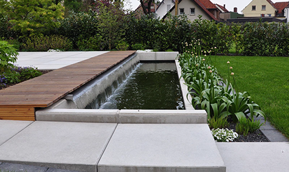 Wasser gehört zum Leben und fügt sich in jeden Garten fließend ein. Das leise Plätschern eines Bauchlaufes, blubbernde Wasserspiele, Fische oder Blumen im Teich lassen die Gedanken schweifen und die Anstrengung des Tages verfliegen.
